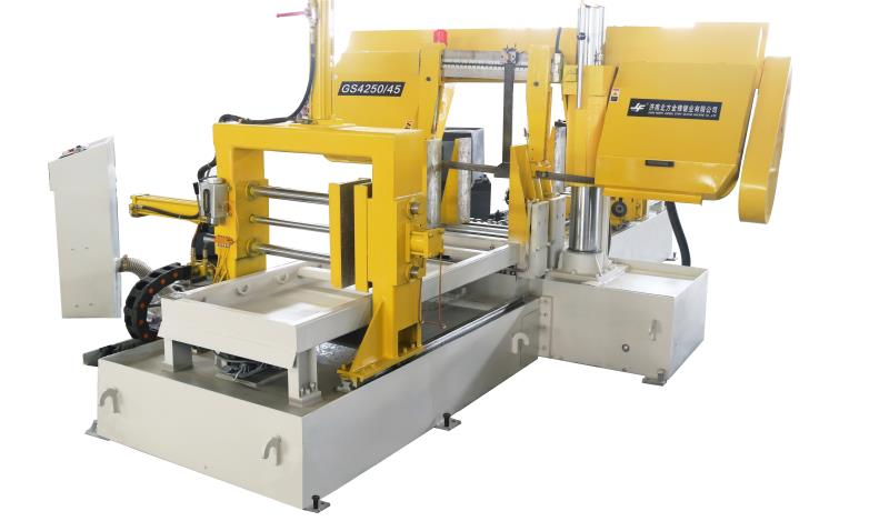 以我司為客戶定制打造的龍門式GS500雙鉗雙壓、前后送料1.2m數(shù)控帶鋸床舉例,如上圖所示,此鋸床采用了兩組自動(dòng)送料裝置(進(jìn)料、出料側(cè)各一組),進(jìn)料側(cè)虎鉗夾緊向前送料,單次最大行程為1.2m,如不能滿足所需長度,則由出料側(cè)送料機(jī)構(gòu)夾緊工件往前拉料,單次型材為1.2m,輥輪為自由輥道,送料機(jī)構(gòu)由液壓驅(qū)動(dòng),長度采用光柵尺檢測(cè),可以多次重復(fù)送料。在鋸床的送料虎鉗座后方安裝光幕開關(guān),可檢測(cè)送料,在檢測(cè)不到材料時(shí)說明需要重新上料,觸摸屏上顯示無料。此定制鋸床的鋸架根據(jù)客戶需求特殊設(shè)計(jì),鋸輪左右輪傾斜2-3°,滿足客戶對(duì)型鋼類材料的鋸切需求,防止型鋼卡鋸,客戶對(duì)此鋸床的使用體驗(yàn)給與了優(yōu)異反饋。